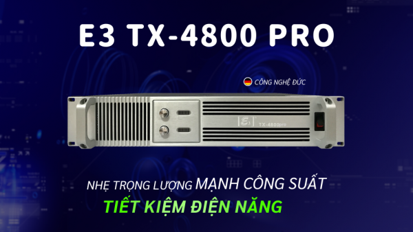 Một cái tên khác thuộc dòng cục đẩy 2 kênh thuộc thương hiệu E3 Audio đang bán chạy nhất hiện nay chính là E3 TX-4800 Pro. Thiết bị cho công suất 800W x 4CH (8Ω Stereo), 1200W x 4CH (4Ω Stereo) và 2000W x 2CH (8Ω Brigde) có thể dễ dàng phối ghép với các dòng loa full, loa ngang, loa sub có công suất vừa, mang đến âm thanh mạnh mẽ.