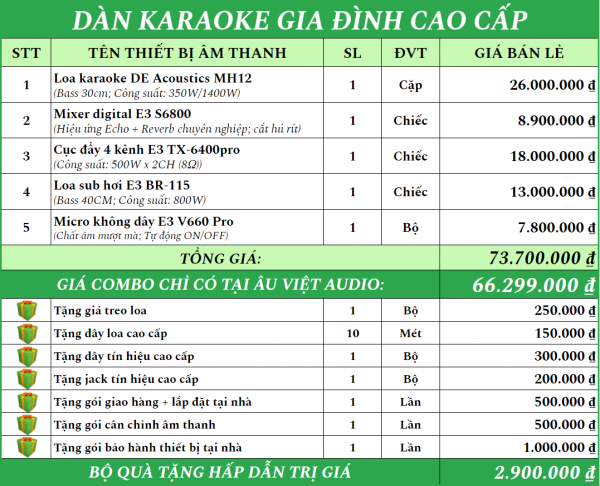 Được phối ghép dựa trên những tiêu chuẩn về nguyên lý âm thanh, MC2 Group mang đến cho khách hàng bộ Dàn karaoke gia đình cao cấp với cấu hình chuyên nghiệp. Bộ dàn gồm những thiết bị chính hãng, công nghệ tiên tiến, thương hiệu uy tín mang đến cho bạn không gian giải trí hiện đại, chất âm cực hay không thua kém bất kỳ phòng hát tại quán karaoke nào.