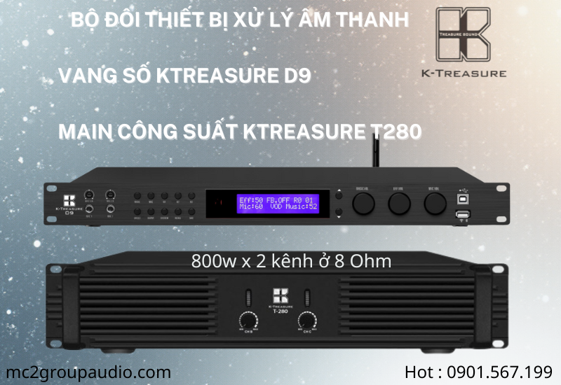 - Vang Số KTreasure D9 : Vang số karaoke có thể coi là bộ não xử lý âm thanh, thành phần quyết định đến chất lượng âm thanh có hòa quyện giữa giọng hát và tiếng nhạc khi phát ra hay không. Vang D9 được chọn lựa cho bộ dàn vì sử dụng các con chip dải mã âm thanh có hiệu năng gần như đứng đầu thị trường hiện nay. Vang số KTreasure D9 còn có thêm cổng phát nhạc bluetooth cực kì tiện dụng không cần đầu karaoke hay tivi vẫn có thể hát karaoke trên điện thoại, ipad