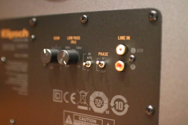 Nút điều chỉnh, cổng kết nối và cầu chì phía sau loa sub