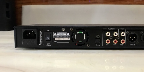Mặt sau của vang số E3 S3200 là khu vực các cổng kết nối thông dụng, quạt tản nhiệt, cổng nguồn, công tắc nguồn. Không cần quá lo vì các khe tản nhiệt có thể sẽ trở nên vô dụng, quạt tản nhiệt ở mặt sau sẽ giúp thiết bị được làm mát nhanh hơn. Mixer cũng có cổng Optical để kết nối quang. Một điều khá tiếc là công tắc nguồn của mixer lại được bố trí ở mặt sau thay vì mặt trước. Điều này khiến mixer khi đặt trong các không gian hẹp sẽ khó thao tác tắt/mở hơn.