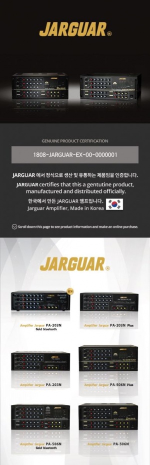 Tất cả sản phẩm amply Hàn Quốc chính hãng từ thương hiệu Jarguar do công ty Nhật Hoàng nhập khẩu đều có tem chính hãng bảo hành điện tử, được dán ở sườn máy bên phải. Khi chọn mua sản phẩm, bạn hãy cào để lấy mã số, sau đó soạn tin: