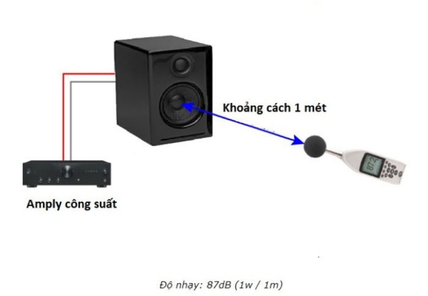 Mức điện áp tiêu chuẩn đầu vào là 2,83 volt, được hiểu là tương ứng với 1 watt nếu loa “đánh” với ampli ở mức trở kháng 8 ohm. Công suất ra của loa đo bằng watt được tính bằng công thức bình phương hiệu điện thế / trở kháng. Trong trường hợp này là 2,832 / 8 = 8,0089/8 =1. Nếu trở kháng là 4 ohm thì công suất sẽ là 2 watt. Bây giờ hãy quan sát mức decibels (dB) đo ở micrô hoặc đồng hồ SPL. Đó chính là độ nhạy của loa.
