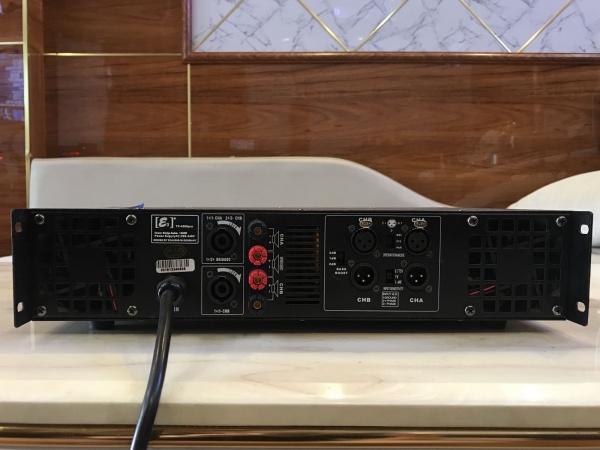 Mặt sau của cục đẩy E3 TX4500 Pro với đẩy đủ thông số kĩ thuật, cổng kết nối, chạm loa. Dây nguồn của main E3 TX-4500 Pro là dây nguồn liền đảm bảo tín hiệu điện truyền tải 1 cách ổn định