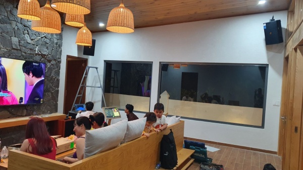 Với căn phòng diện tích hơn 50m2, các kĩ thuật viên MC2 Group đã phối ghép 2 cặp loa De Acoustics MH10 bass 25cm, dòng loa với công suất 250w / cái đảm bảo độ phủ âm thanh toàn phòng cũng như có thể mở cửa để phát nhạc ra không gian ngoài trời.
