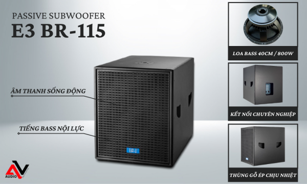 Loa sub E3 BR-115 là dòng loa siêu trầm mới nhất của hãng E3 Audio được ra mắt trong năm 2020 tại thị trường Việt Nam. Sub hơi E3 BR-115 có khả năng tái tạo âm trầm tốt hơn hẳn những sản phẩm loa sub khác bán trên thị trường bởi mức công suất mạnh mẽ lên đến 800W với củ loa bass 40cm. Âm trầm được tái tạo cực kỳ uy lực, trầm ấm, rõ nét khi xuống sâu và lan tỏa đều không gian.