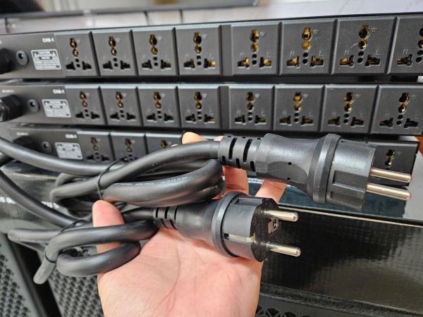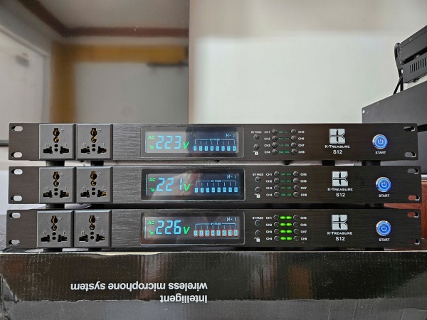 Nguồn S12 thiết kế mỏng chuẩn 1U có tai bắt tủ máy, vỏ nhôm phay sơn đen chắc chắn, mạnh mẽ. Mặt trước S12 với các nút nhấn mở từng kênh độc lập, by pass thông toàn bộ kênh và nút lock kênh. Nút nguồn có đèn sáng tiện thao tác vào buổi tối