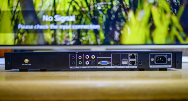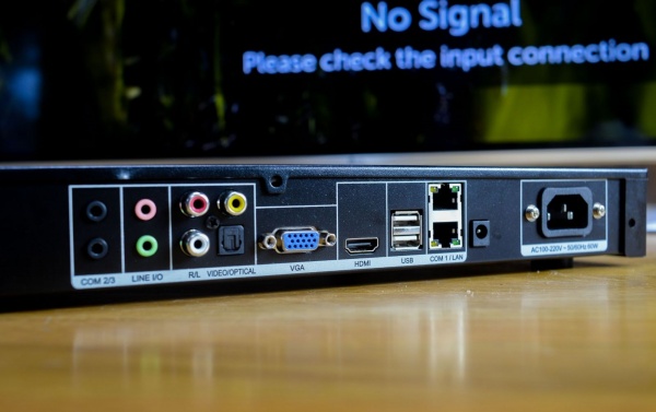 Tất cả các cổng kết nối sẽ được bố trí ở mặt sau, chúng ta có cổng HDMI, 2 cổng USB, cổng LAN, cổng optical,... Đáng chú ý nhất là cụm cổng COM để kết nối từ máy với màn hình cảm ứng - một phụ kiện đi kèm cho phép chúng ta tinh chỉnh toàn bộ các chức năng của máy và hơn thế nữa.