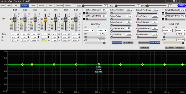 Hiệu ứng Effect bao gồm 2 phần Echo và Reverb riêng biệt cho phép căn chỉnh riêng biệt tùy thuộc vào mục đích sử dụng như karaoke ( nhiều echo ), trình diễn ngoài trời sân khấu ( nhiều Reverb ) . Các cấu hình được lưu lại và chỉ 1 thao tác bấm trên remote hoặc thao tác trực tiếp trên thiết bị là có thể chuyển đổi qua lại giữa các cấu hình với nhau